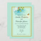 An elegant nature themed wedding invitation. An abstract background with circles and swirly shapes. The colour is a soothing summery green, turquoise and yellow in light pastel colours. A couple of orange and yellow butterflies hovering around some delicate flowering blossoms with green leaves and brown branches. Has a delighful, magical look.. A gold bordered transparent overlay in the centre displays all your wedding information. The background is mint green.
