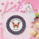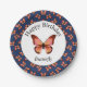 This personalized birthday party paper plate is embellished with pretty graphic butterflies in shades of orange, pink and black.