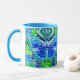 Coffee mug in a digital batik pattern of large butterflies on an ornate, arabesque medallion background, in shades of cobalt blue, turquoise and jade green