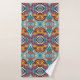 Towel set in a digital batik pattern of large butterflies on an ornate, arabesque medallion background, in shades of amber, orange, aqua and beige