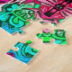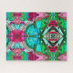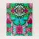 Puzzle in a digital batik pattern of a large butterfly on an ornate, arabesque medallion background, in shades of turquoise and deep rose pink