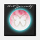 Butterfly Bubbles is a digital art design with pink and white fire, bubbles in a circle with a cut out butterfly shape and glowing light blue outer edge.
