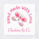 Pretty pink and white whimsical motif and custom text labels; ideal for all those crafty folk who make clothing for friends or for sale in a small business. Shown here with a cute butterfly image and text which reads Hand Made With Love all this and your name/business name are fully editable at no extra cost.