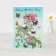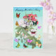 A flight of colorful butterflies flutter around red and white roses, on a shaded blue background. The inside text can be changed for your own message. This is a beautiful card, sure to please!