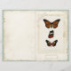 Vintage junk journal page with blue and brown butterfly scientific illustration on the front and brown butterfly illustration on the back. French drawings and annotations. Teal paisley background and parchment pages with gold labels, tape and stitching details in the centre. Fold in half to make journal pages.