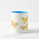 A white mug with a blue rim and handle and a delicate painted desing of orange butterflies.