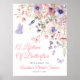 Welcome guests to your bridal shower with this whimsical and romantic welcome sign, perfect for an "A Lifetime of Butterflies" themed celebration. The design features a soft and delicate arrangement of watercolor wildflowers and greenery, with multiple pink and purple butterflies fluttering across the layout. The color palette includes blush pinks, dusty rose, lilac, lavender, violet, and fresh greens for a dreamy, garden-inspired look.