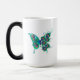 Artistically drawn, fictional, green, detailed butterfly with green, beautiful, peacock feathers on white background.