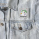 Snowman is shoveling the snow wearing his top hat. Pine trees are in the background. The 3d globe stands out against the grey background of the button. "Happy Holidays" is written beneath.