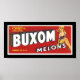 Vintage fruit crate label for Buxom Brand Melons from Yuma, Arizona.