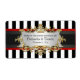 Elegant, chic and stylish customizable party accessories with a black and white striped pattern, a black and red satin ribbon and a gold filigree look label.