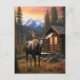 * The MOOSE is in the beautiful woods / Forest. by a a Sweet CABIN / COTTAGE / LODGE . MOUNTAINS are in the background.