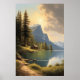 cabin facing a lake near the mountains poster