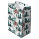 Winter scene with a cabin in woods with evergreen trees and Christmas deer, modern holiday pattern.