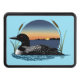 Un huard dans un lac au coucher du soleil et des cailloux dans un décor bleu