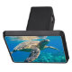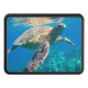 Photo sous-marine d'une tortue de mer nageant dans une eau cristalline juste en dessous de la surface.