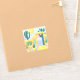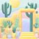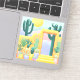 This sticker features a pretty cactus garden scene that was inspired by a drive from Santa Fe, New Mexico to Phoenix, Arizona. The desert landscape features saguaro cacti, potted cactus plants, and succulents along a yellow stucco wall. A doorway leads to purple and pink hills and a setting sun.