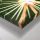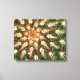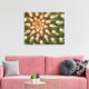 Lovely stretched canvas print shows a dynamic image of a symmetrical, dark green spherical cactus with orange and white spines that radiate outward like a starburst.
