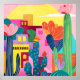 A vibrant desert scene featuring blooming cacti, colourful geometric buildings, and a glowing sunset. The bold colour palette blends warm pinks, yellows, and deep blues, creating a lively Southwestern atmosphere. Perfect for adding a touch of warmth and artistic charm to any space!