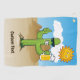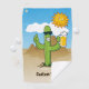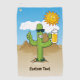 Cartoon of smiling cactus with sunglasses in desert landscape holding a beer mug and giving thumbs up. Custom text.