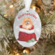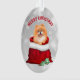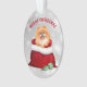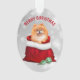 Un adorable petit chien roux de Poméranie sort d'un sac cadeau rouge sur le devant de cet ornement de Noël. Quelques ampoules turquoises et or motif Holiday sont juste devant le sac Père Noël.Le texte au-dessus de l'image dit "MERRY CHRISTMAS" en rouge. L'image et le texte sont placés sur un arrière - plan de livre abstrait argenté. Le fond de l'ornement a la même image, mais avec le texte "HAPPY NEW YEAR" en vert turquoise.