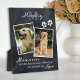 Plaque commémorative rustique pour animaux avec un fond d'ardoise fausse sombre, l'initiale et le nom de votre chien, 2 photos à remplacer par les vôtres, empreintes de pattes de cœur et une citation de sympathie qui dit 'les souvenirs sont le moyen pour le cœur de garder ceux que nous aimons'.