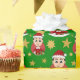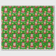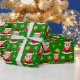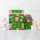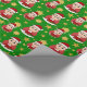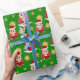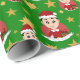 Papier d'emballage de Noël avec l'illustration d'un joli et souriant garçon aux cheveux noirs, il porte un costume de Père Noël rouge et blanc et tient un cadeau ; avec le texte modifiable modèle pour votre nom ou message, le design de Noël avec un arrière - plan vert transparent avec étoiles