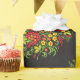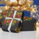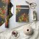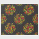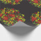 Papier d'emballage russe Hohloma, art russe, fraises rouges, feuilles jaunes, arrière - plan noir