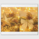 Papier cadeau de Noël élégant avec de beaux ornements dorés (étoile, arc, perles), cônes de pin et lumières scintillantes de Noël.
