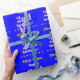 Ce simple design papier d'emballage d'anniversaire comporte un message comme "Prénom, heureux 2e anniversaire!", où le nom et le numéro d'anniversaire peuvent être customisés. Il présente également des formes étoiles décoratives. L'arrière - plan est de couleur bleue. Un papier comme celui-ci pourrait peut-être servir à envelopper les cadeaux qui sont donnés pour célébrer l’anniversaire de quelqu’un. [~Z0000243]