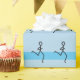 Exécution de l'enveloppement cadeau à thème avec un motif Runner Figure sur un arrière - plan bleu clair avec des bandes bleues plus foncées.