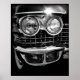 A high contrast, black and white photograph of a Cadillac Eldorado, focused on the beautiful chrome of its grill and lights.