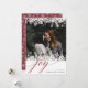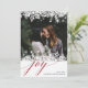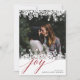 Le design élégant et moderne des cartes de vacances comprend votre photo préférée encadrée en haut et en bas par une bordure d'illustrations de flocs de neige blancs. "Joy" apparaît sous la typographie de script de calligraphie chic. Personnalisez avec votre salutation personnalisée et les noms en bas à droite. Les cartes retournent à un motif de flocon de neige assorti sur un rouge de canneberge riche et festif.