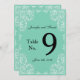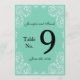 Une bordure à motif de dentelle blanche encadrée fait de cette carte de numéro de table de réception de mariage un choix charmant pour votre jour spécial. Illustré ici avec un fond aqua, vous pouvez personnaliser la couleur de fond de votre choix pour compléter votre thème et vos couleurs de mariage. Modifiez le texte du numéro de table exemple affiché ici avec vos informations en sélectionnant le bouton "Personnaliser" et en remplissant vos informations. Vous pouvez changer les polices et les tailles de police ainsi que déplacer le texte pour répondre à vos besoins. Des cartes et produits supplémentaires sont disponibles dans ce design, y compris des invitations de mariage, des cartes de réponse RSVP, des cartes "Save the Date", des autocollants, des serviettes de cocktail et plus encore.