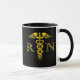 An image of caduceus medical symbol and stylized letters R and N - Registered Nurse. Elegant artsy coffee mug. You can transfer this design to another product, just use the option hereinafter. Have fun, buy one, enjoy, stay safe, and be happy!