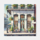 This painting captures a cozy cafe storefront in New Orleans, beautifully blending modern simplicity with the city’s historic charm. The cafe features large glass windows framed by intricate wrought iron, a colourful brick facade, and a minimalist sign above the entrance. Hanging flower baskets and lush greenery add a fresh and inviting touch, while a small outdoor seating area with modern wooden tables and chairs lines the cobblestone sidewalk. The backdrop showcases the unique French-inspired architecture of New Orleans, including ornate balconies and hints of the vibrant street life. The bright, clean palette of crisp whites, warm brick tones, and vibrant greens highlights the lively yet relaxed atmosphere, perfect for enjoying coffee in this picturesque setting.