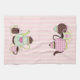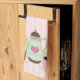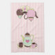 Jolie serviette de cuisine rayée rose et crème, avec des graphiques de tasses à thé et café et des tasses avec soucoupes, en brun, rose et vert tendance. Customisez d'ajouter tout texte que vous souhaitez. Ajoute une touche douce à toute cuisine.