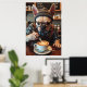 Start your day with a laugh—this poster showcases a French Bulldog in human form, decked out in a green and white flannel shirt, suspenders, and thick glasses. He’s mid-latte pour behind a trendy coffee bar, showing off serious barista focus. His expression says he’s already had three shots of “Bark Roast.” Silly chalkboard drink names complete the scene. A perfect pick for kitchens, cafés, or anyone who loves dogs, coffee, and quirky wall art.