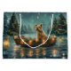 Set sail into the magic of the holiday season with this beautifully detailed illustration, showcasing a proud dog sitting in a festively decorated boat, gliding across a serene Christmas lake. The twinkling lights from nearby pine trees reflect off the water, casting a warm, festive glow that enhances the cozy ambiance. Ornaments dangle from the boat's sides, while glowing lanterns light the way, creating a scene that captures the true essence of Christmas warmth and joy. This nostalgic artwork brings a touch of holiday magic to any space, perfect for those who cherish the spirit of the season.