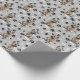 An image of an adorable Cairn Terrier Dog is the feature in the pattern on this all occasion gift wrapping paper. The dog sits amid a pattern of black paw prints and white bones, and is repeated on a light grey background.