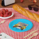These cute paper plates have a graphic illustration featuring a pair of cartoon cake characters wearing chequered oven mitts facing off with wooden spoons in front of a stainless steel oven door with a cake baking inside. Easily customized for your kitchen contest or competition.