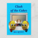 This cute graphic illustration features a pair of cartoon cake characters wearing chequered oven mitts facing off with wooden spoons in front of a stainless steel oven door with a cake baking inside. This postcard is customized for your kitchen contest or competition.