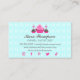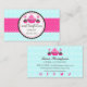 © 2021 Socialite Designs Inc. Cupcake and cake pops business card design with a bright pink polka-dot ribbon and vibrant turquoise pattern background. A pink cupake and two cake pops are inside a lace/scalloped text banner where you can add your bakery business information. The back adds an area for more information about your business.