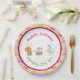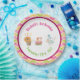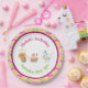 Personalized paper plates for a birthday party. Designed with a cute illustration of a smiling lion wearing a party hat, a fuzzy sheep with birthday balloons and a birthday cake with 3 candles. Set on a pink, green and yellow geometric pattern with a zig zag brick design. Personalize with your event details.