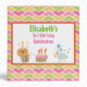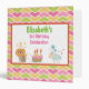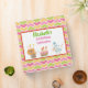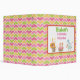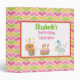 A personalized birthday party commemorative memory binder. Designed with a cute illustration of a smiling lion wearing a party hat, a fuzzy sheep with birthday balloons and a birthday cake with 3 candles. Set on a pink, green and yellow geometric pattern. Perfect for 3 year old's birthday but also good for birthdays of all ages.