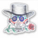 * A hand drawn sketch combination a Calavera sugar skull, wearing a black top hat and clenching a thorny rose in his mouth.