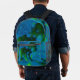 L'oeuvre abstraite en bleu et vert de ce sac à dos à couture imprimée a été réalisée à partir d'une photo originale de ZoeSPEAK de calcaire, dans un banc de sable à la plage. La forme en vert foncé et citron vert ressemble presque à un animal qui se promène dans l'eau bleue de l'eau.