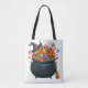 Caldron Of Giggle & Gummies Tote Bag. A cheerful caldron beams, stuffed with candies exploding like confetti, proudly sporting a witch hat. Its broomstick buddy leans close, clearly waiting for sweet-fueled liftoff, Halloween’s happiest sugar-powered witch-mobile!