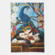 Calico cat playing with a red Chinese dragon in front of a peacock stained glass window.
