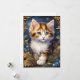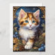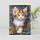 Holiday card with a fluffy cute calico cat posing in a decorative gold frame adorned with pinecones and winter foliage, under a starry night sky. "Happy Holidays" on back can be customized or left blank for a handwritten message.